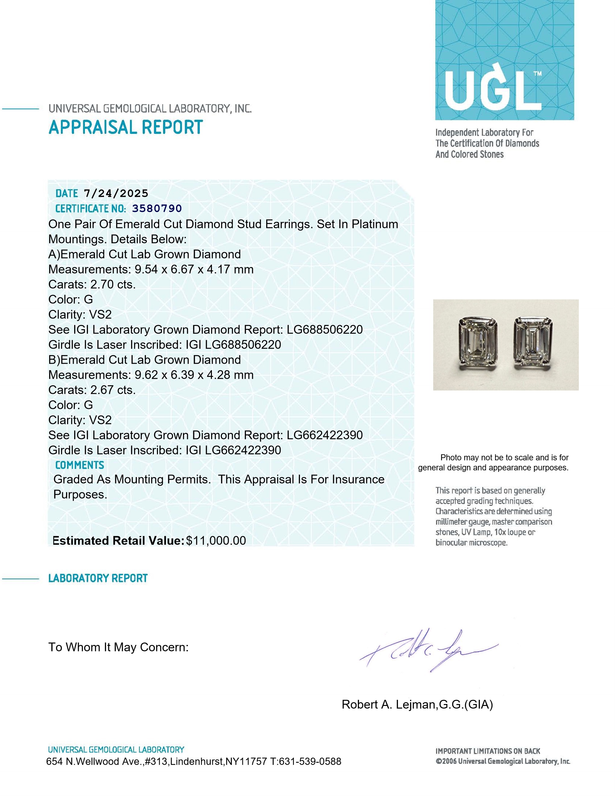$11,000 5.37ct Lab Grown PLATINUM Diamond Stud Earrings G, VS2 Emerald Cut IGI & UGL CERT New
